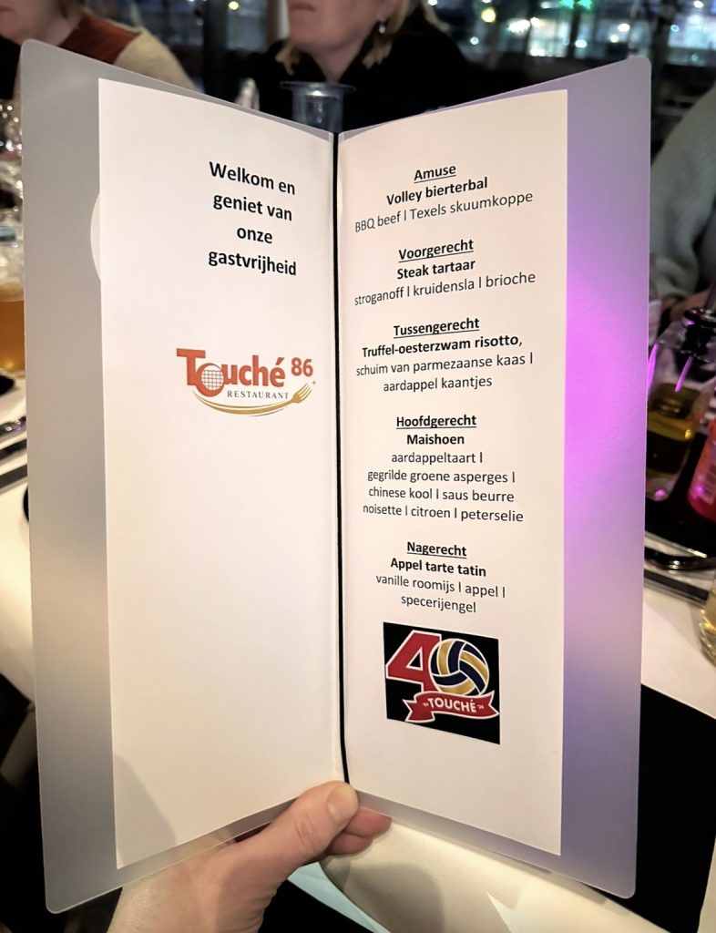 Vanavond vierden we het jubileumjaar van Touché ‘86 op een wel heel smakelijke manier. Met een grote groep vanuit de hele vereniging gingen we samen uit eten. Op uitnodiging van Bob, speler van Touché ‘86 en docent koken, waren we te gast in opleidingsrestaurant Chapeau van het ROC van Flevoland in Almere, dat voor deze avond was omgedoopt tot het Touché ‘86-restaurant.
