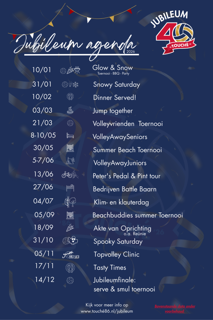 In aanloop naar ons 40-jarig jubileum hebben we de afgelopen maanden ontzettend veel toffe ideeën ontvangen van onze leden. Daar zijn we heel blij mee! Met al deze input zijn we aan de slag gegaan om een mooi en gevarieerd programma samen te stellen — voor jong tot oud, voor spelers, oud-leden en iedereen die Touché een warm hart toedraagt.