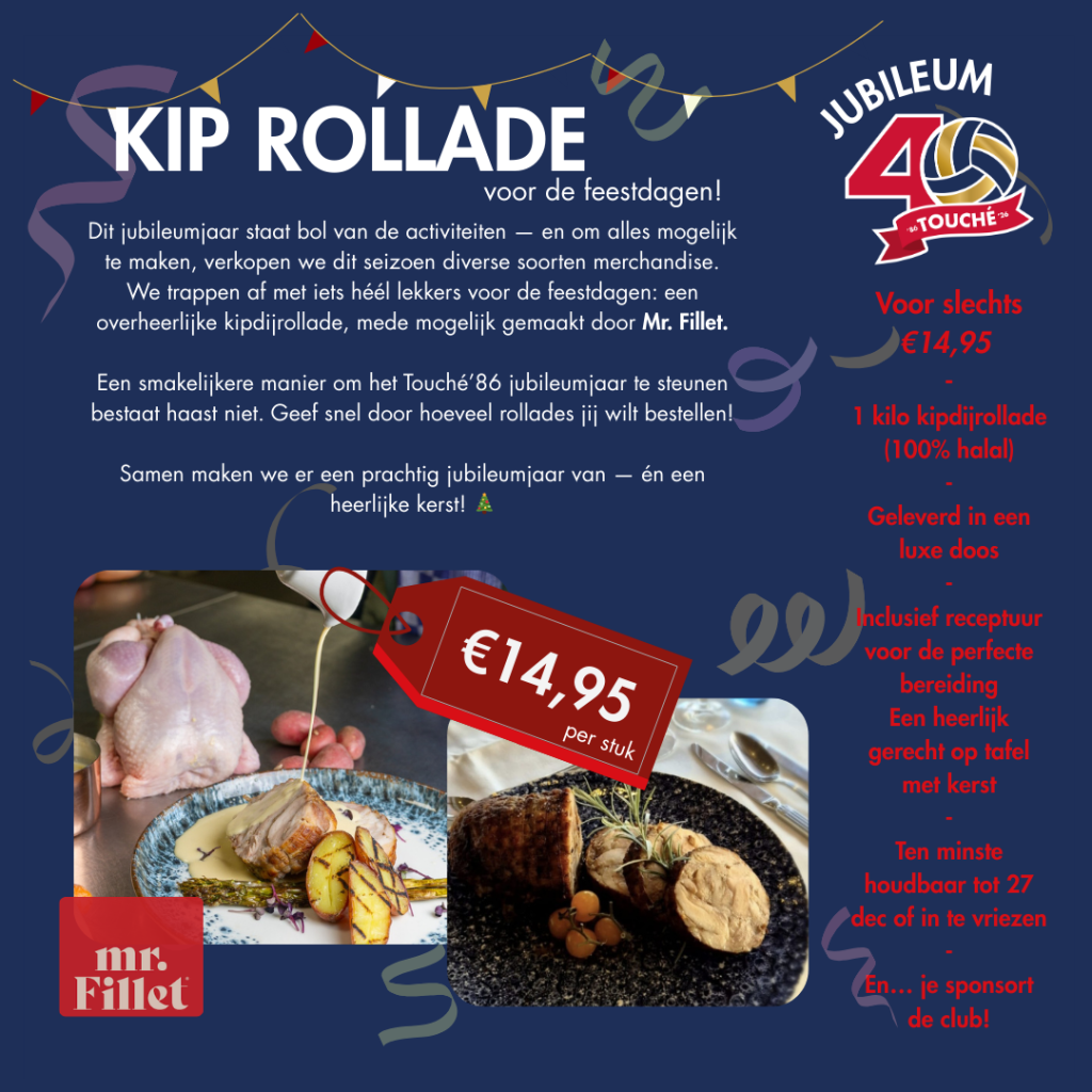 Dit jubileumjaar staat bol van de activiteiten — en om alles mogelijk te maken, verkopen we dit seizoen diverse soorten merchandise. We trappen af met iets héél lekkers voor de feestdagen: een overheerlijke kipdijrollade, mede mogelijk gemaakt door Mr. Fillet.
